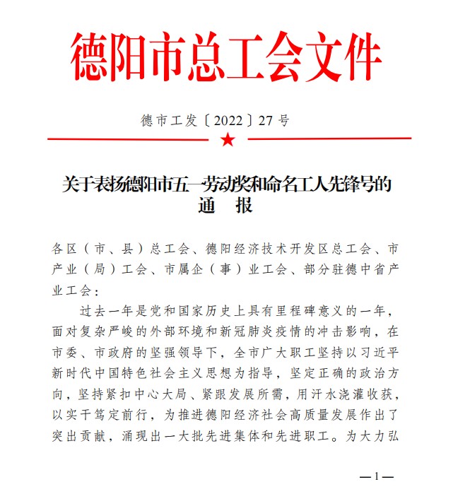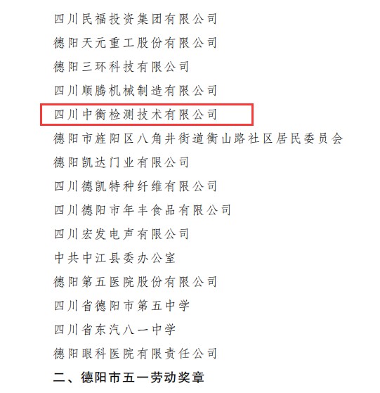 在4月27日德阳市总工会文件中,四川中衡检测技术有限公司在《关于表扬德阳市五一劳动奖和命名工人先锋号的通报》里,受到了“德阳市五一劳动奖状”的表彰。