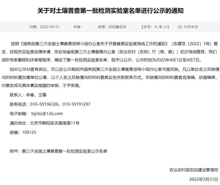 四川中衡检测技术有限公司按照《国务院第三次全国土壤普查领导小组办公室关于开展普查实验室筛选工作的通知》(农建发〔2022〕3号)要求,通过了层层选拔,进入了第一批检测实验室名单,筛选为“普查检测实验室”。