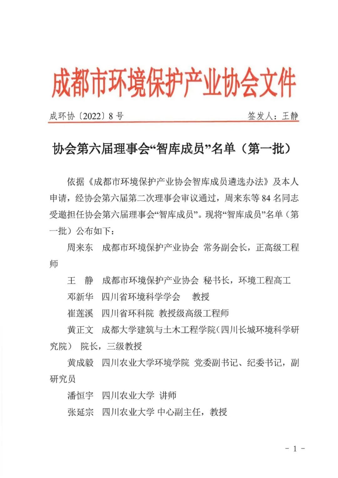 成都市环境保护产业协会于近日公布了协会第六届理事会“百名青年企业家”名单(第一批)和“智库成员”名单(第一批),我司总经理邱鑫海先生均入选。