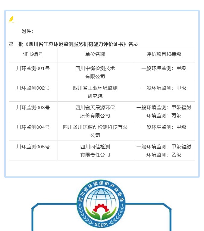 2月25日,四川省环境保护产业协会发布了首批《四川省生态环境监测服务机构能力评价证书》名录。
