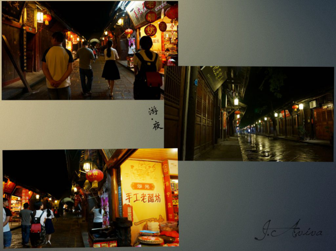 趁着男同胞们喝酒的空隙,我们余下的几个人便一同去夜色里寻觅雨后古城味道去了。可能因为已经十点过加上雨夜的缘故,来往行人并不多,却更觉远离喧嚣后难得的平静。