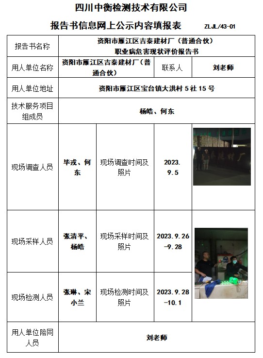 资阳市雁江区吉泰建材厂(普通合伙) 职业病危害现状评价报告书