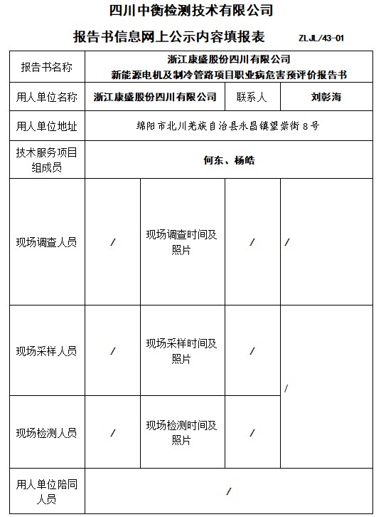 浙江康盛股份四川有限公司 新能源电机及制冷管路项目职业病危害预评价报告书