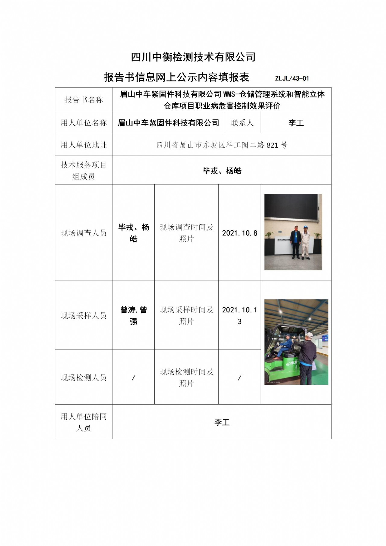 眉山中车紧固件科技有限公司WMS-仓储管理系统和智能立体仓库项目职业病危害控制效果评价