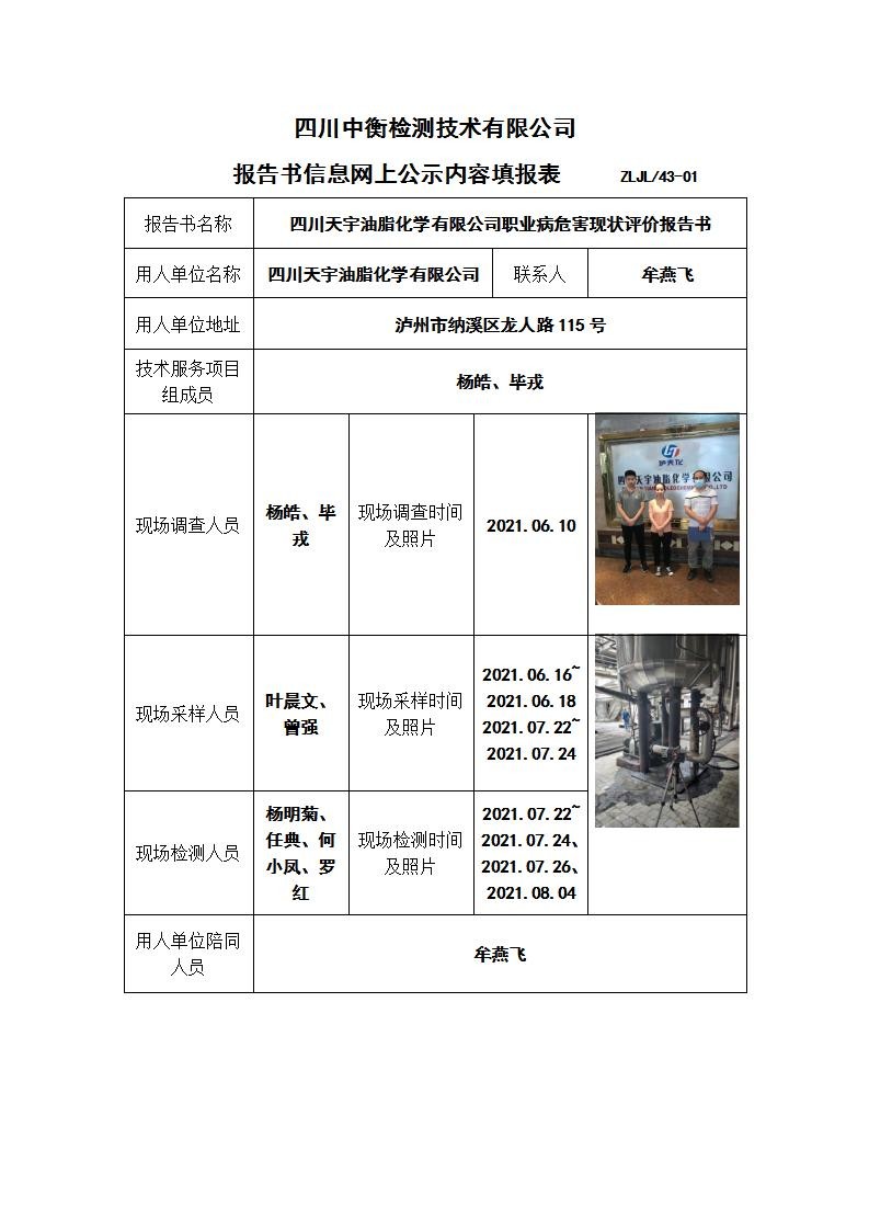 四川天宇油脂化学有限公司职业病危害现状评价