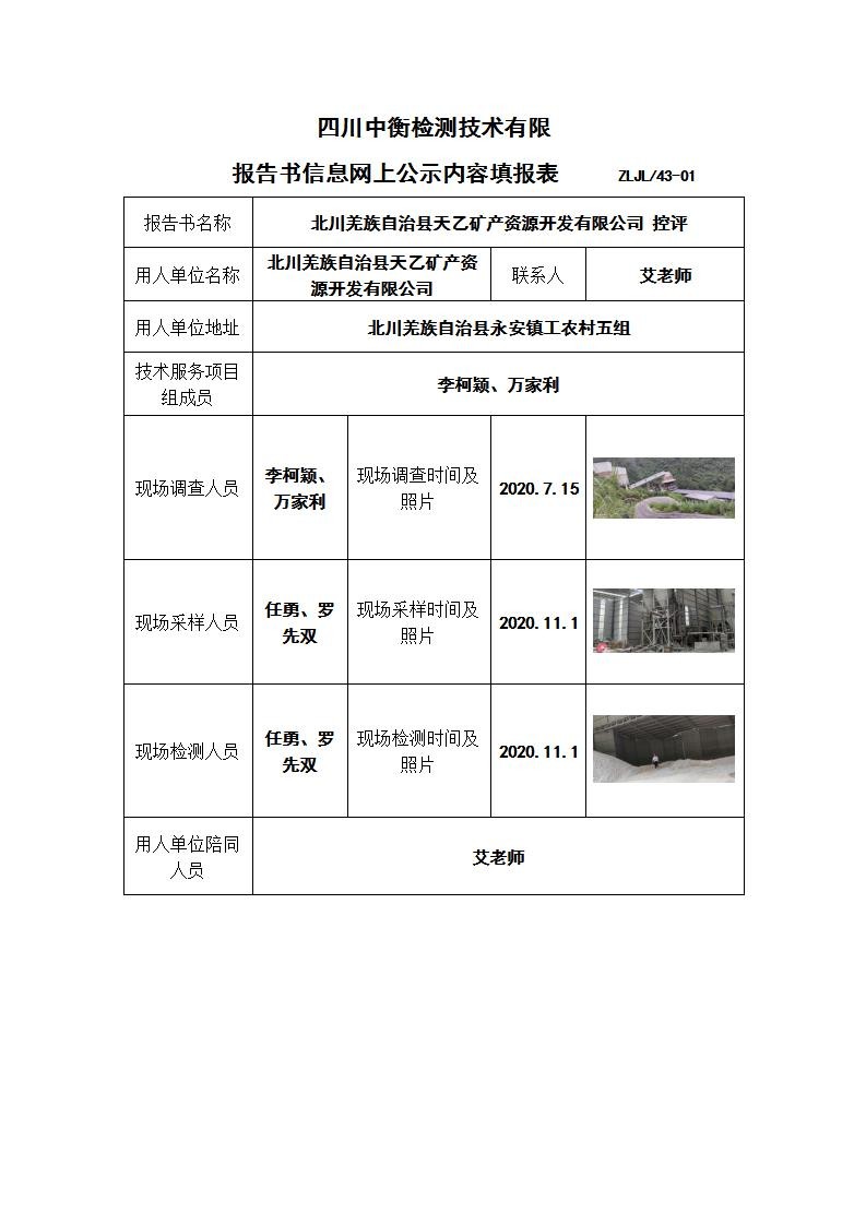 北川羌族自治县天乙矿产资源开发有限公司 控评
