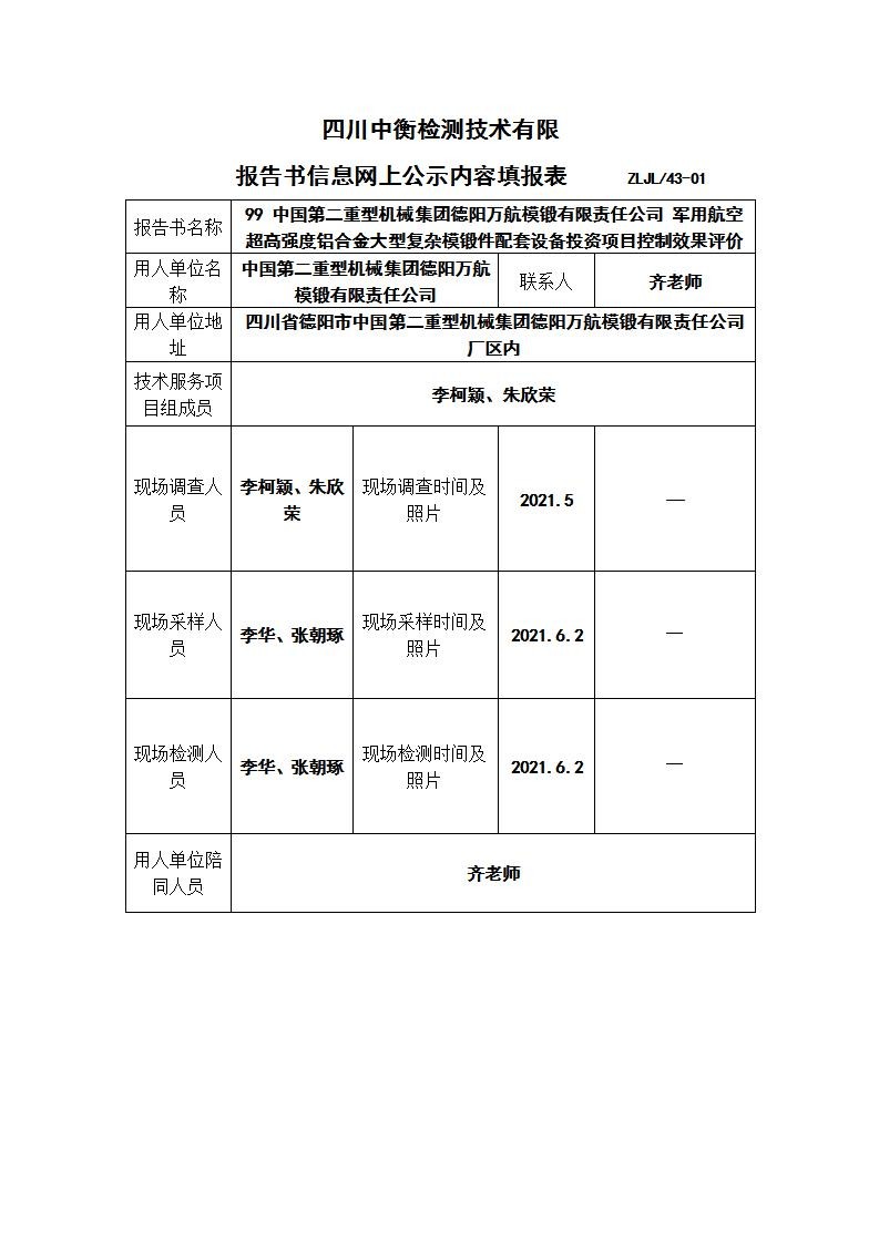 中国第二重型机械集团德阳万航模锻有限责任公司 军用航空超高强度铝合金大型复杂模锻件配套设备投资项目控制效果评价
