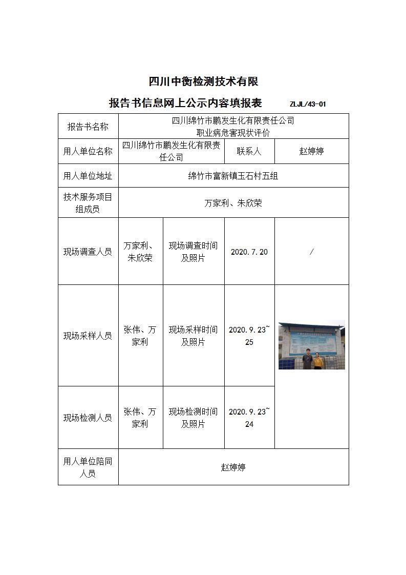 四川绵竹市鹏发生化有限责任公司 职业病危害现状评价