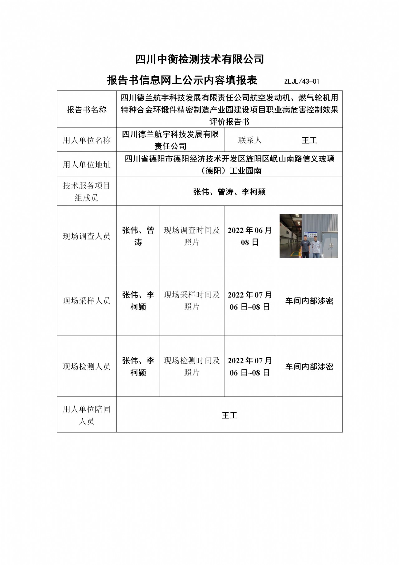 四川德兰航宇科技发展有限责任公司航空发动机、燃气轮机用特种合金环锻件精密制造产业园建设项目职业病危害控制效果评价