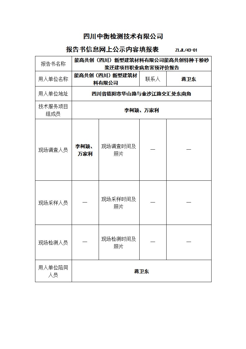 能高共创(四川)新型建筑材料有限公司能高共创特种干粉砂浆迁建项目职业病危害预评价报告