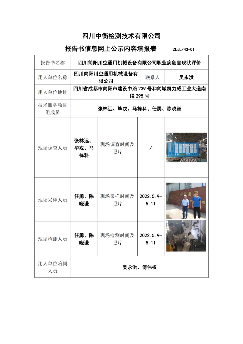 四川简阳川空通用机械设备有限公司职业病危害现状评价