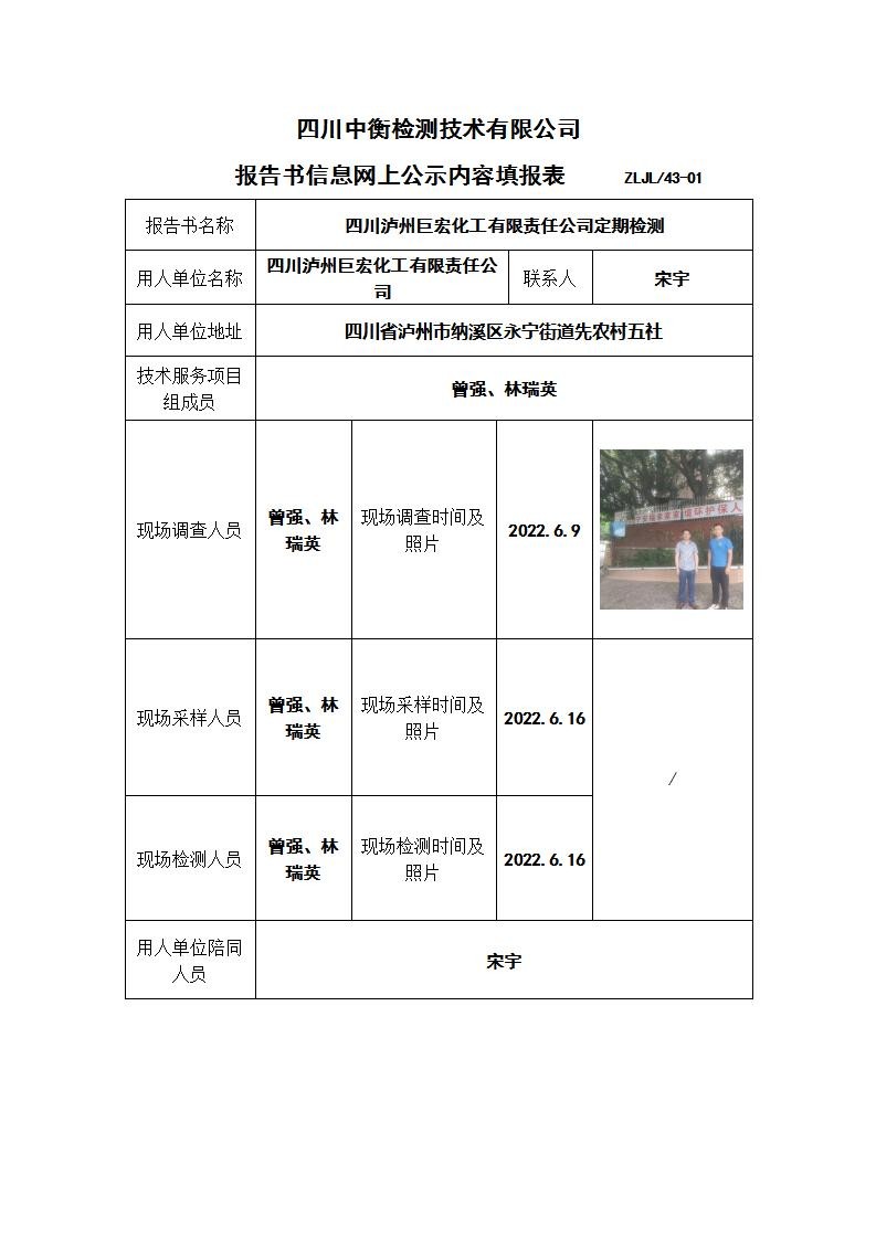 四川泸州巨宏化工有限责任公司职业病危害定期检测