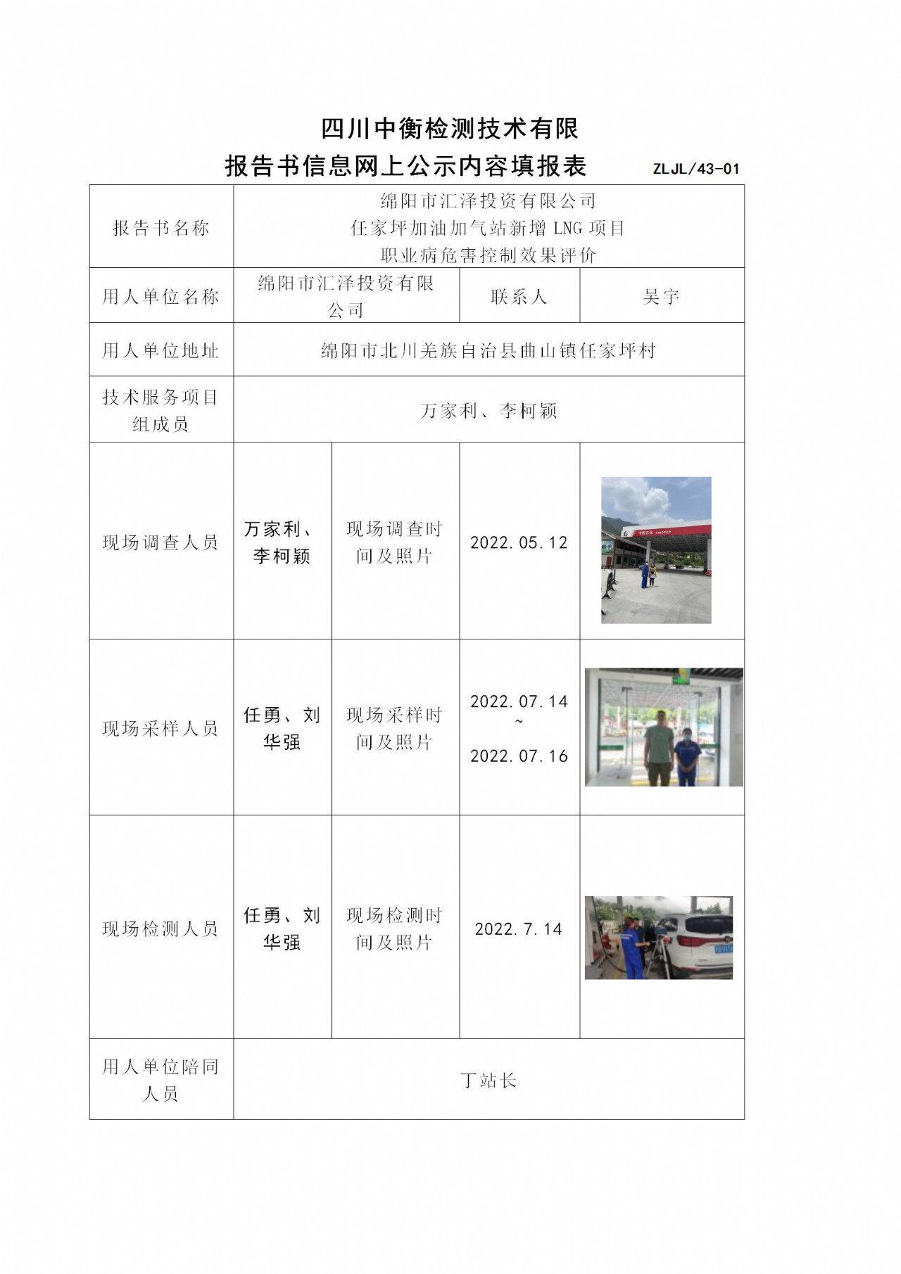 绵阳市汇泽投资有限公司 任家坪加油加气站新增LNG项目 职业病危害控制效果评价