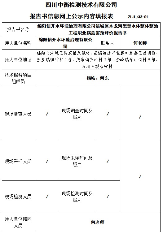绵阳信开水环境治理有限公司涪城区木龙河黑臭水体整体整治工程职业病危害预评价