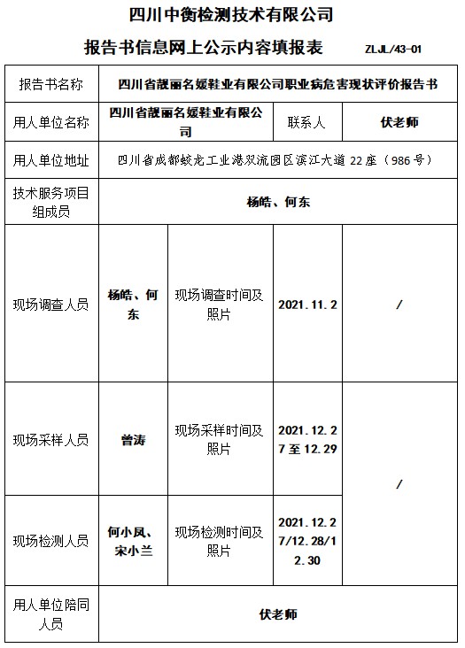 四川省靓丽名媛鞋业有限公司职业病危害现状评价