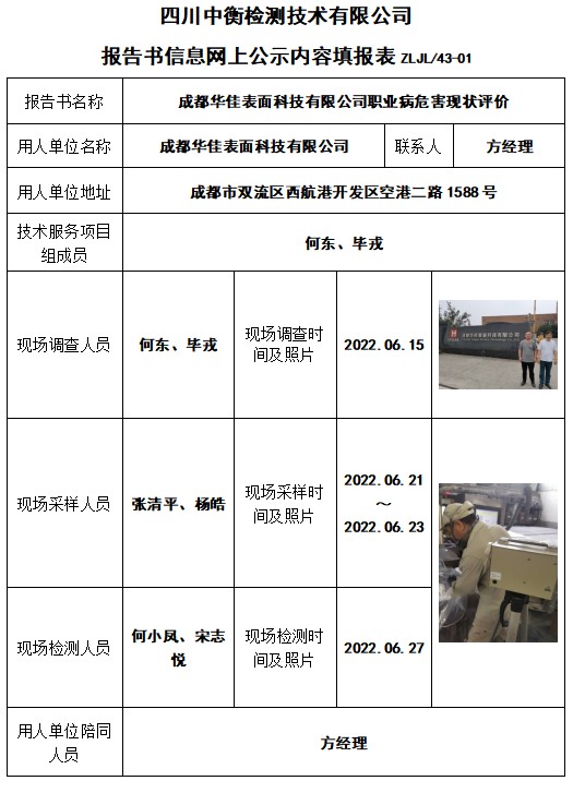 成都华佳表面科技有限公司职业病危害现状评价
