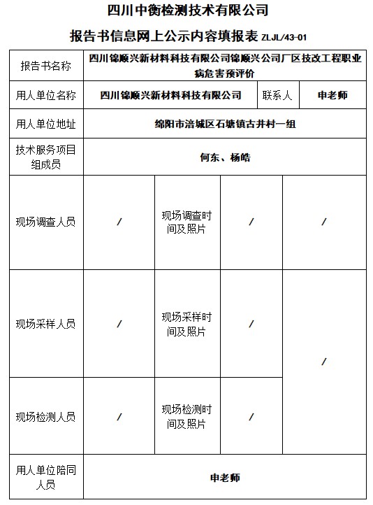 四川锦顺兴新材料科技有限公司锦顺兴公司厂区技改工程职业病危害预评价