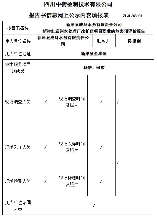 新津县成环水务有限责任公司 新津红岩污水处理厂改扩建项目职业病危害预评价
