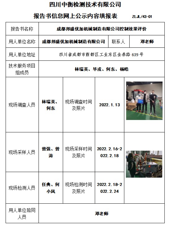 成都邦盛优加机械制造有限公司控制效果评价