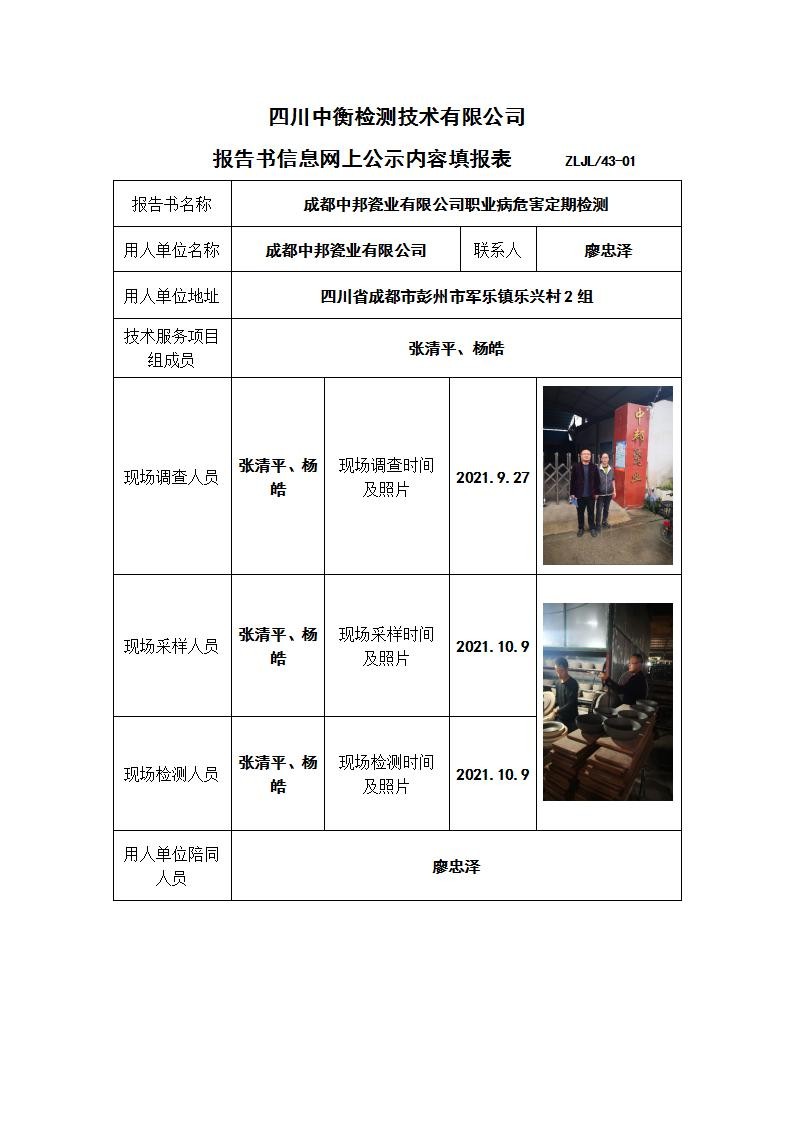 成都中邦瓷业有限公司职业病危害定期检测