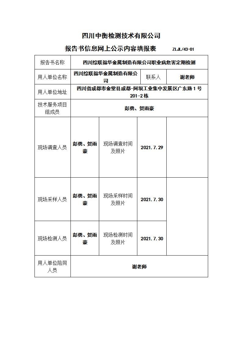 四川综联福华金属制造有限公司职业病危害定期检测