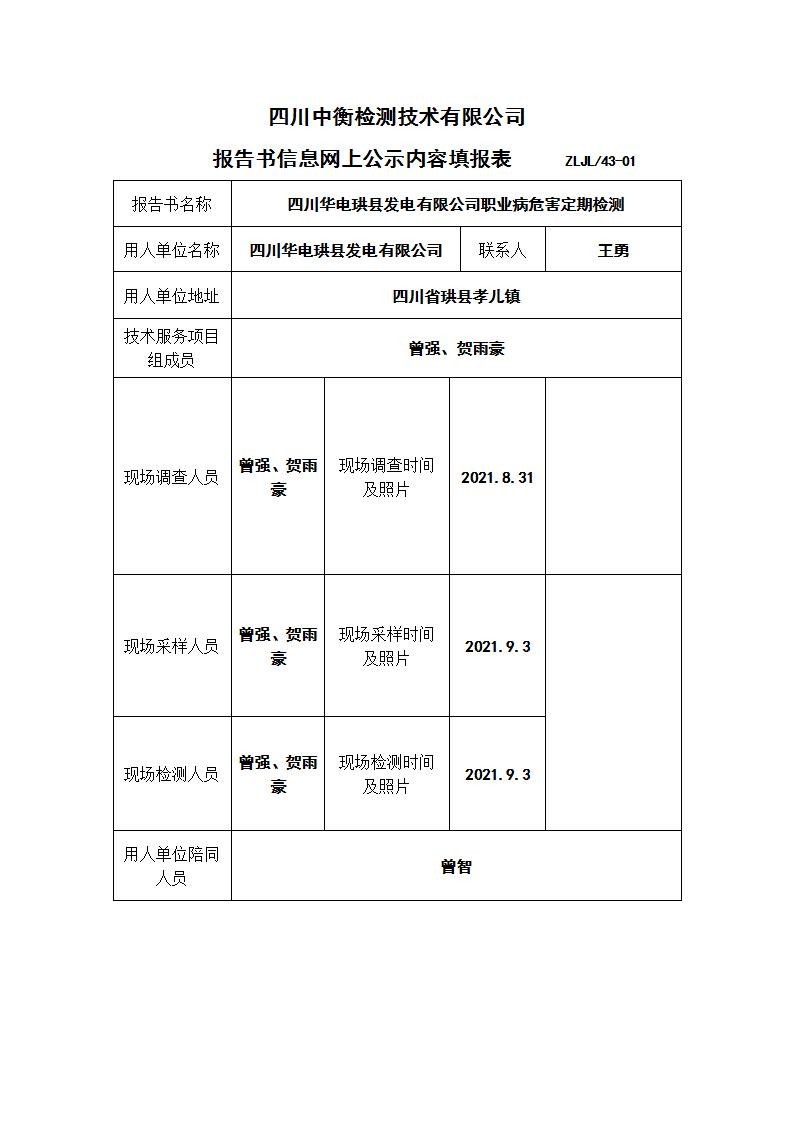 四川华电珙县发电有限公司职业病危害定期检测