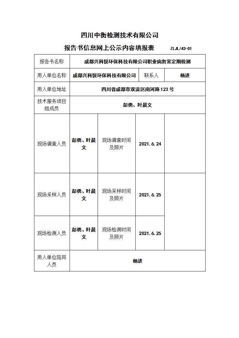 成都兴科锐环保科技有限公司职业病危害定期检测