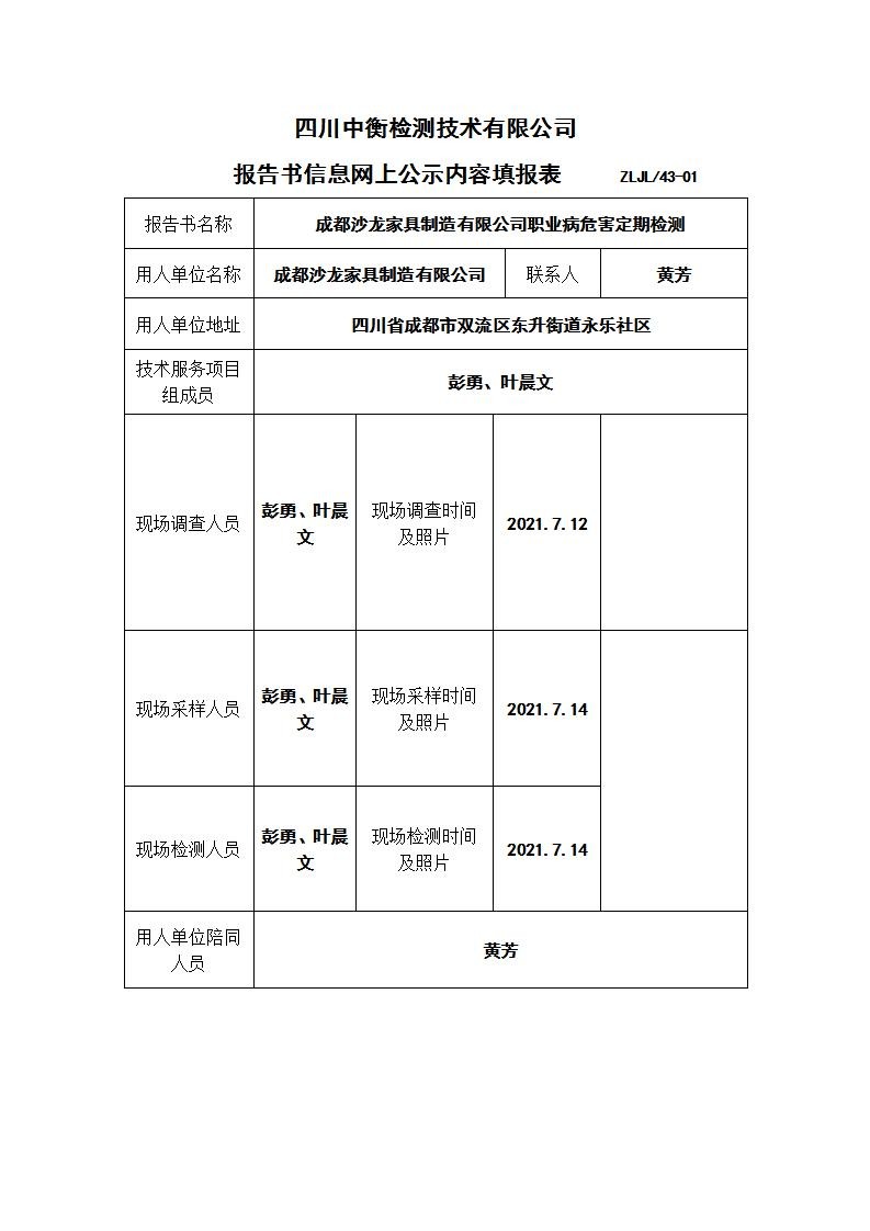 成都沙龙家具制造有限公司职业病危害定期检测