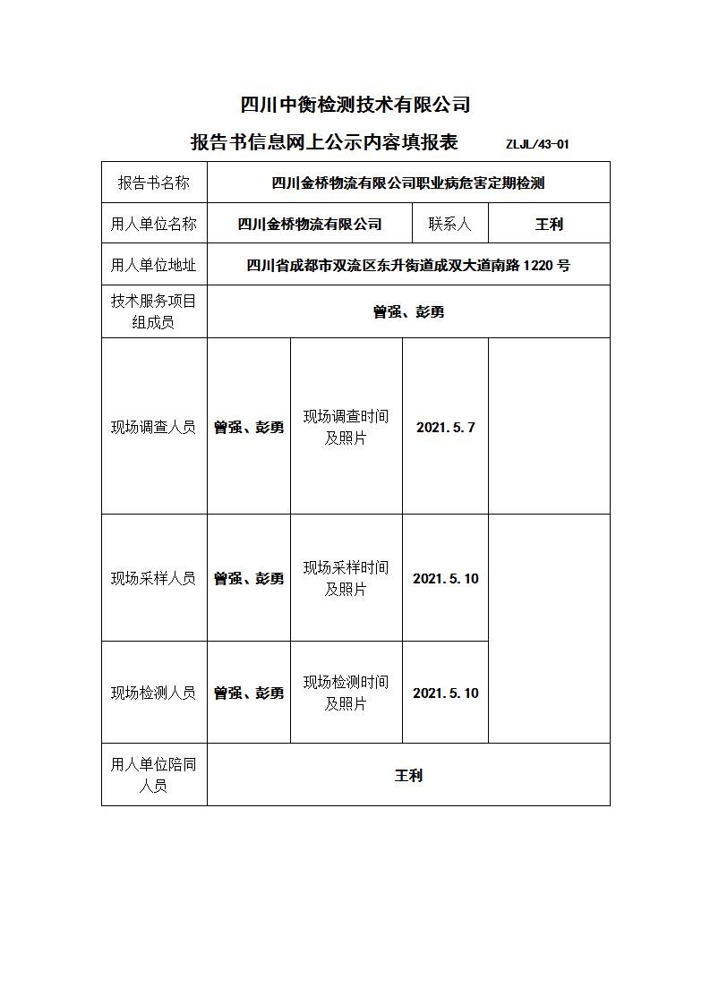 四川金桥物流有限公司职业病危害定期检测