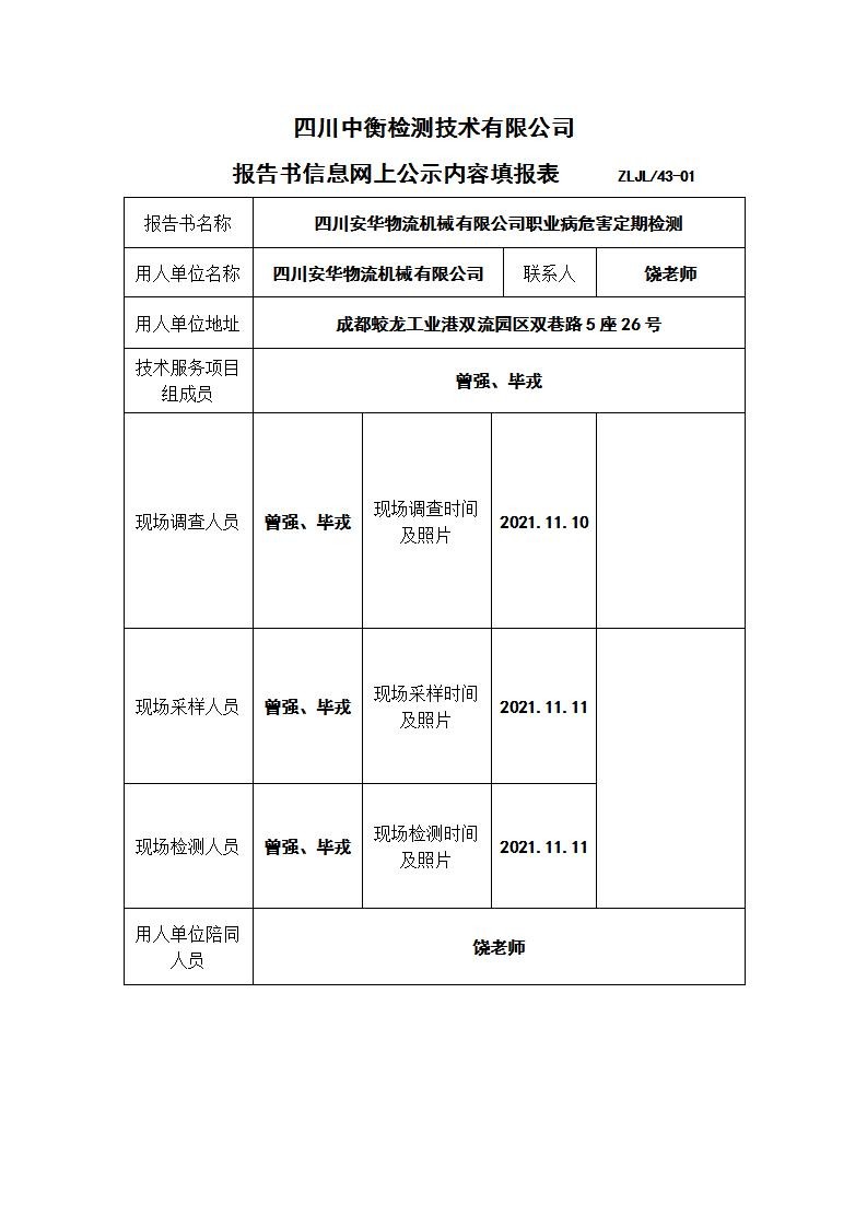 四川安华物流机械有限公司职业病危害定期检测