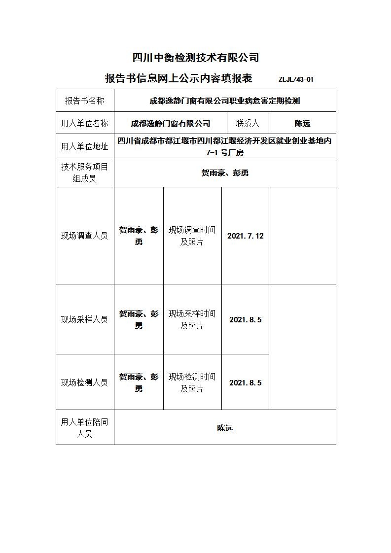 成都逸静门窗有限公司职业病危害定期检测