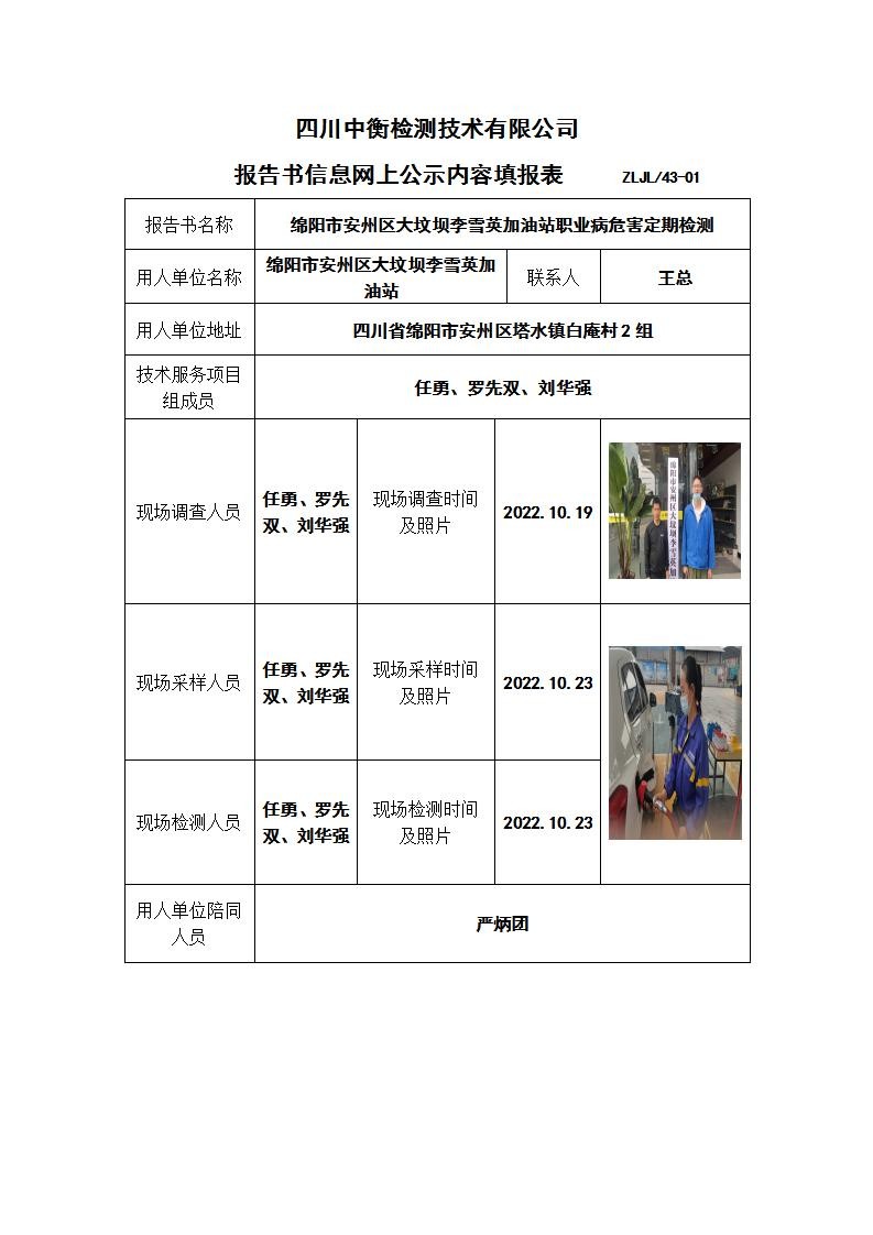 绵阳市安州区大坟坝李雪英加油站职业病危害定期检测