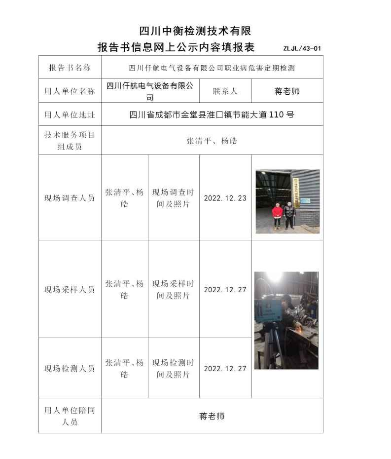 四川仟航电气设备有限公司职业病危害定期检测