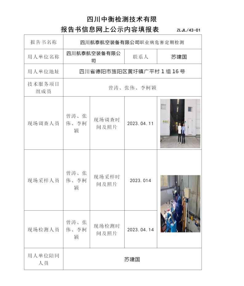 四川航泰航空装备有限公司职业病危害定期检测