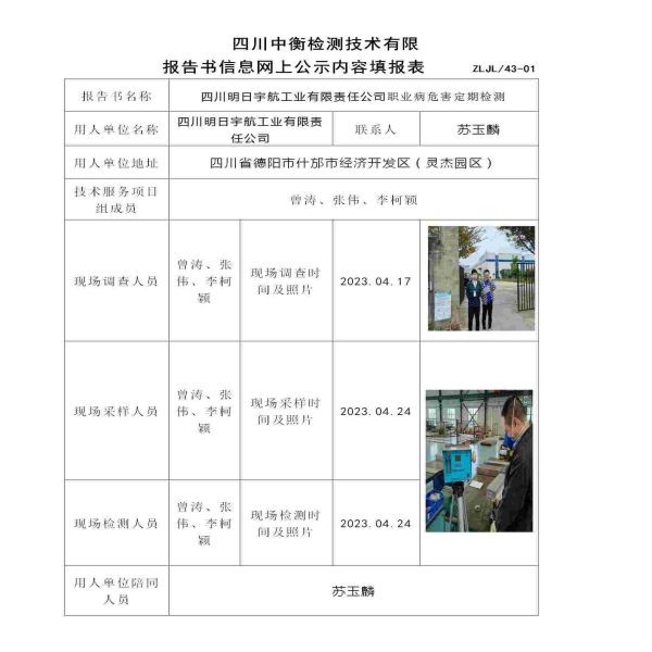 四川明日宇航工业有限责任公司职业病危害定期检测
