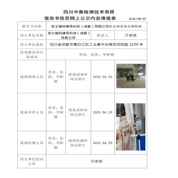 亚士辅材建筑科技(成都)有限公司职业病危害定期检测