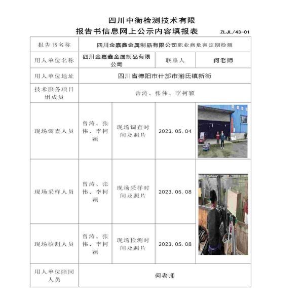 四川金嘉鑫金属制品有限公司职业病危害定期检测