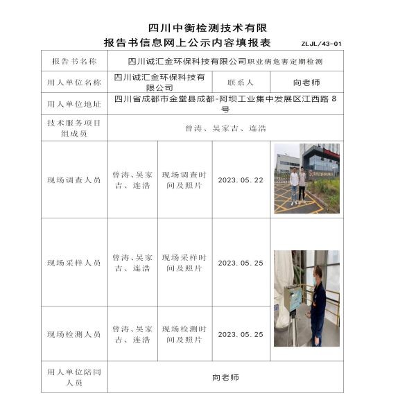 四川诚汇金环保科技有限公司职业病危害定期检测
