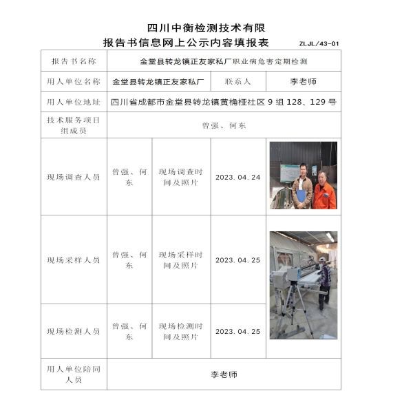 金堂县转龙镇正友家私厂职业病危害定期检测