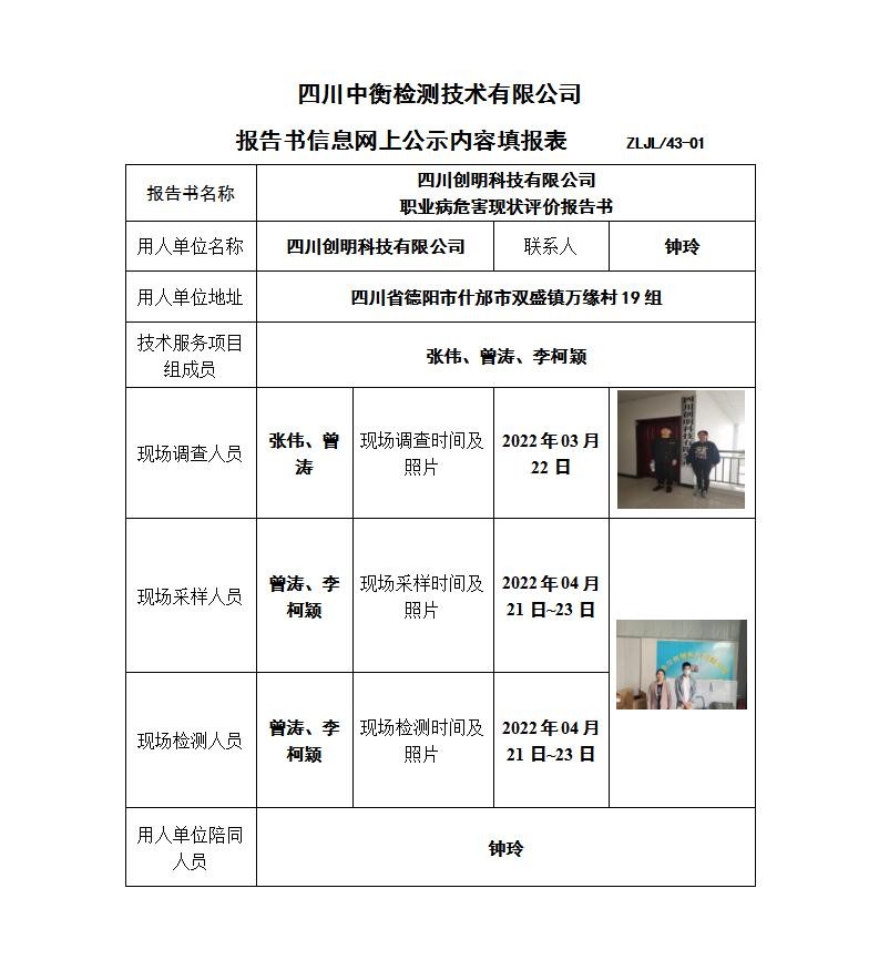 四川创明科技有限公司职业病危害现状评价