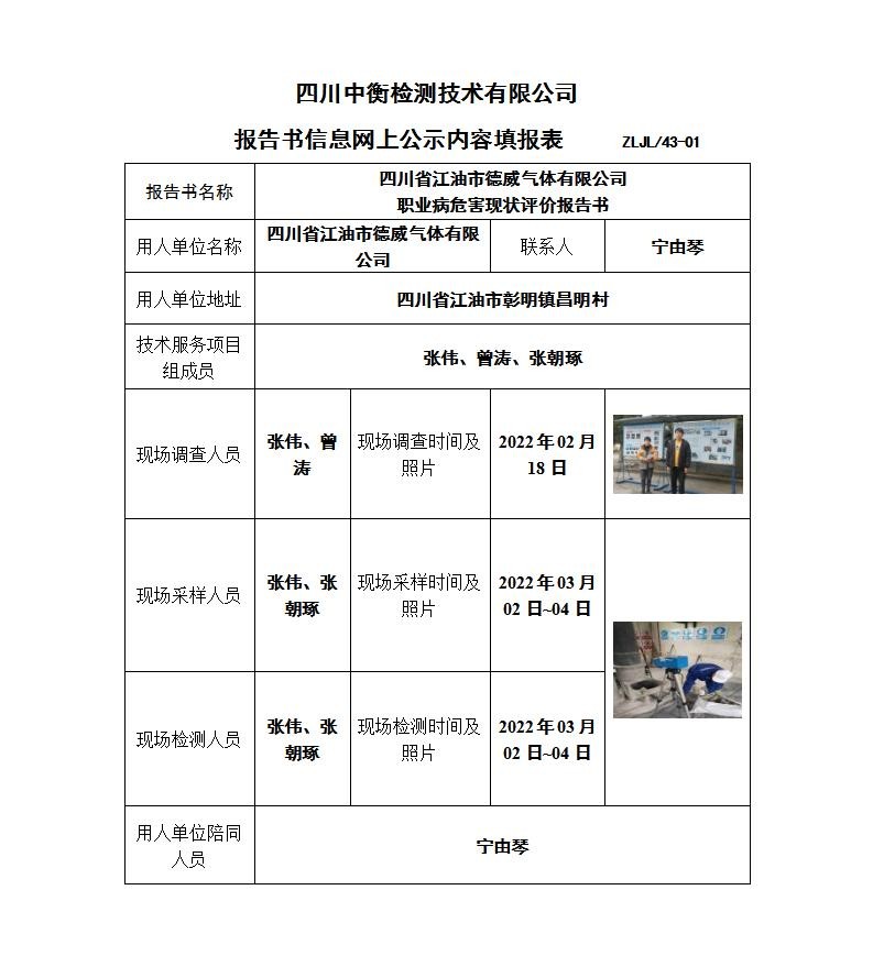 四川省江油市德威气体有限公司职业病危害现状评价
