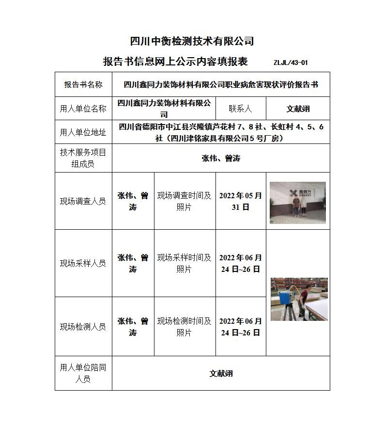四川鑫同力装饰材料有限公司职业病危害现状评价