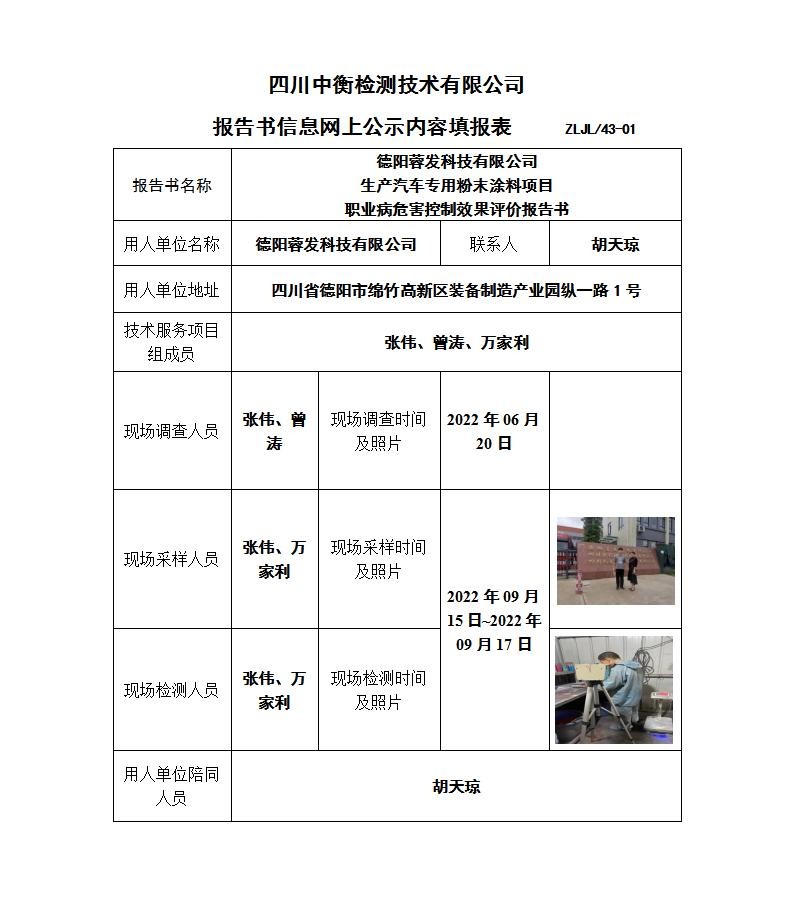 德阳蓉发科技有限公司生产汽车专用粉末涂料项目职业病危害控制效果评价