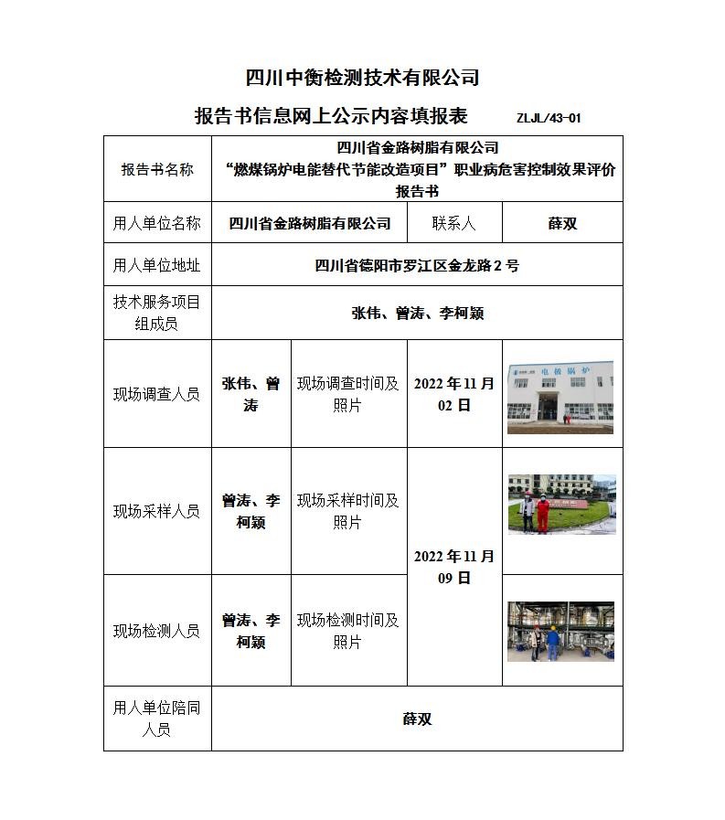 四川省金路树脂有限公司 “燃煤锅炉电能替代节能改造项目”职业病危害控制效果评价