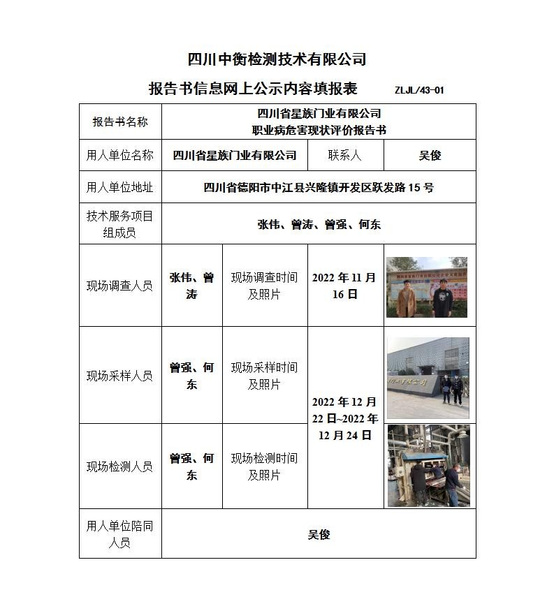 四川省星族门业有限公司 职业病危害现状评价
