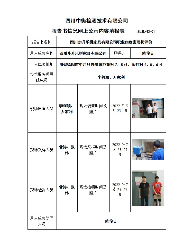 四川步升乐拼家具有限公司 职业病危害现状评价报告书