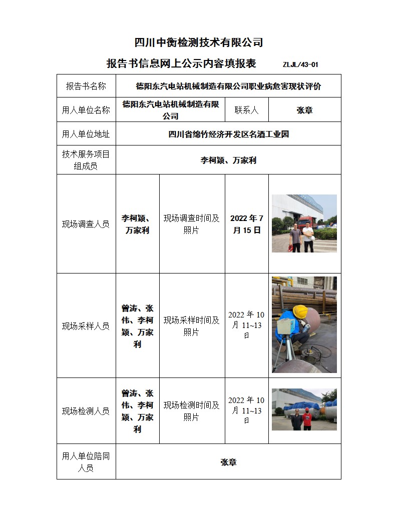 德阳东汽电站机械制造有限公司 职业病危害现状评价报告书