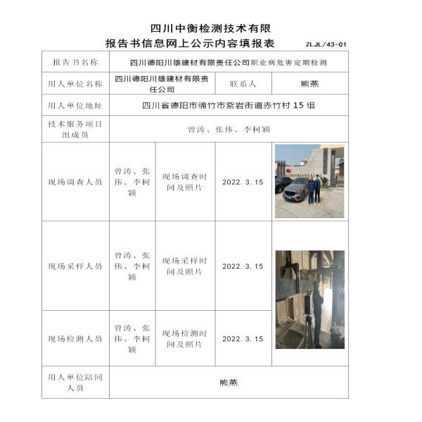 四川德阳川雄建材有限责任公司职业病危害定期检测