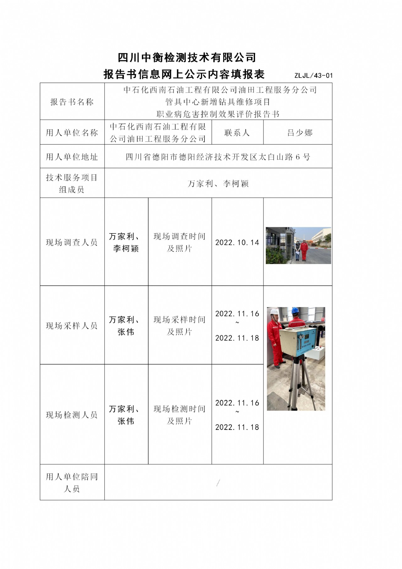中石化西南石油工程有限公司油田工程服务分公司 管具中心新增钻具维修项目 职业病危害控制效果评价