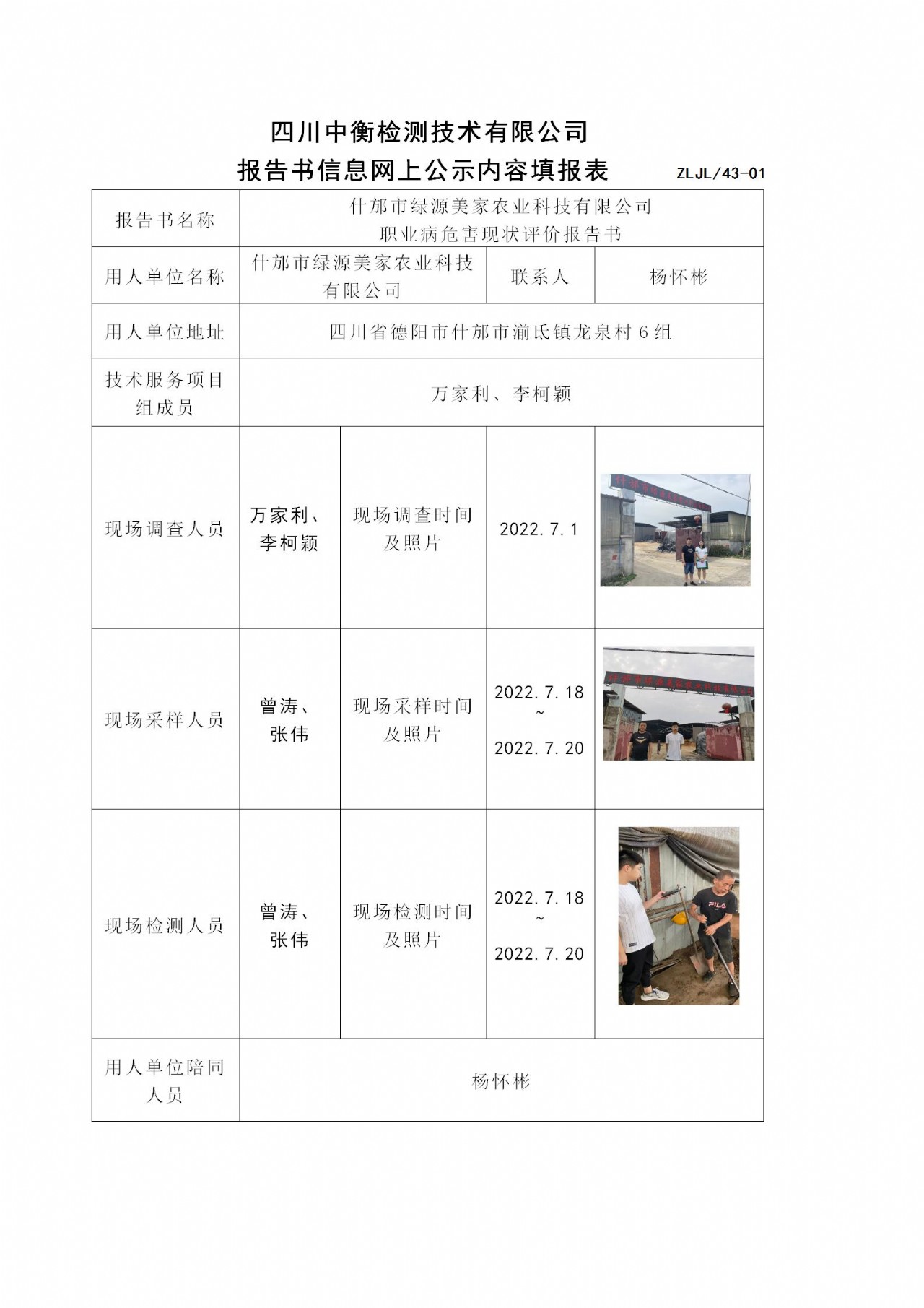 什邡市绿源美家农业科技有限公司 职业病危害现状评价